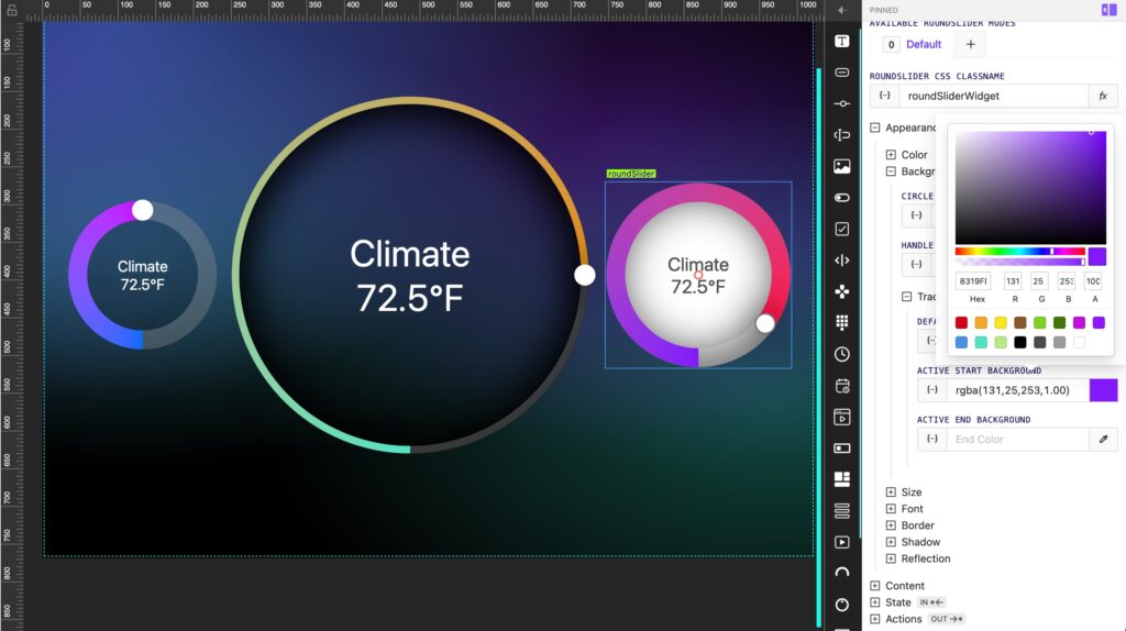 It’s time to introduce the new ColorPicker element. It allows you to add any RGB color range.It can store its state with any dynamic data; similar to RoundSlider, it is fully responsive and can adapt to any parent width and height.